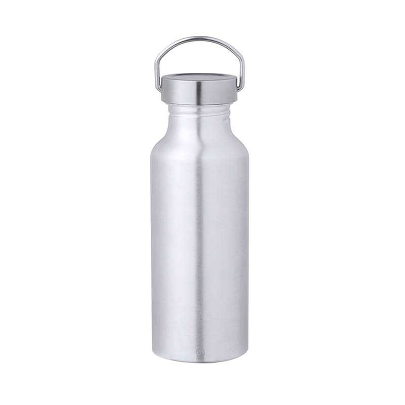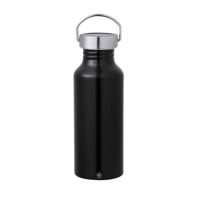 NOVINKA 2025. 700ml capacity bottle. Made of resistant and sustainable recycled aluminium. With matt screw cap and matching integrated handle for easy carrying. Satin finish body. Available in a wide range of colours, and BPA free. Including Recycled Aluminium logo. Presented in a kraft design box and in an individual recycled bag.Recycled aluminium is a material with almost infinite recycling possibilities, without losing its original properties and consuming less energy in the process.