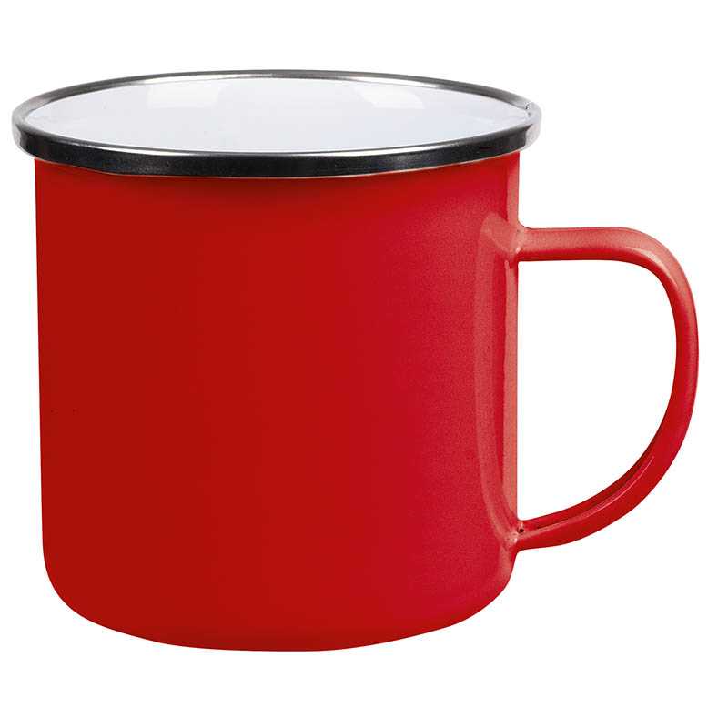 Enamel drinking mug (350 ml) with stainless steel edge. Individually packaged in a brown cardboard box