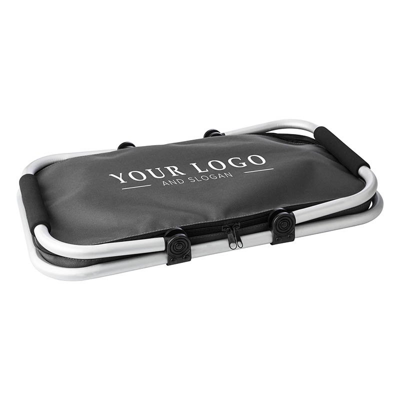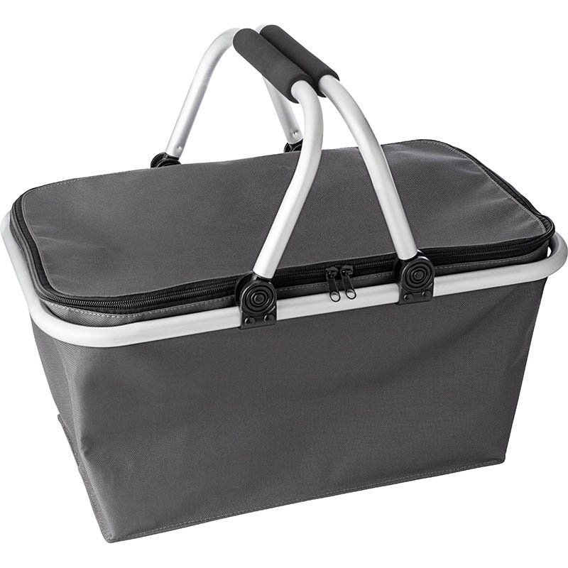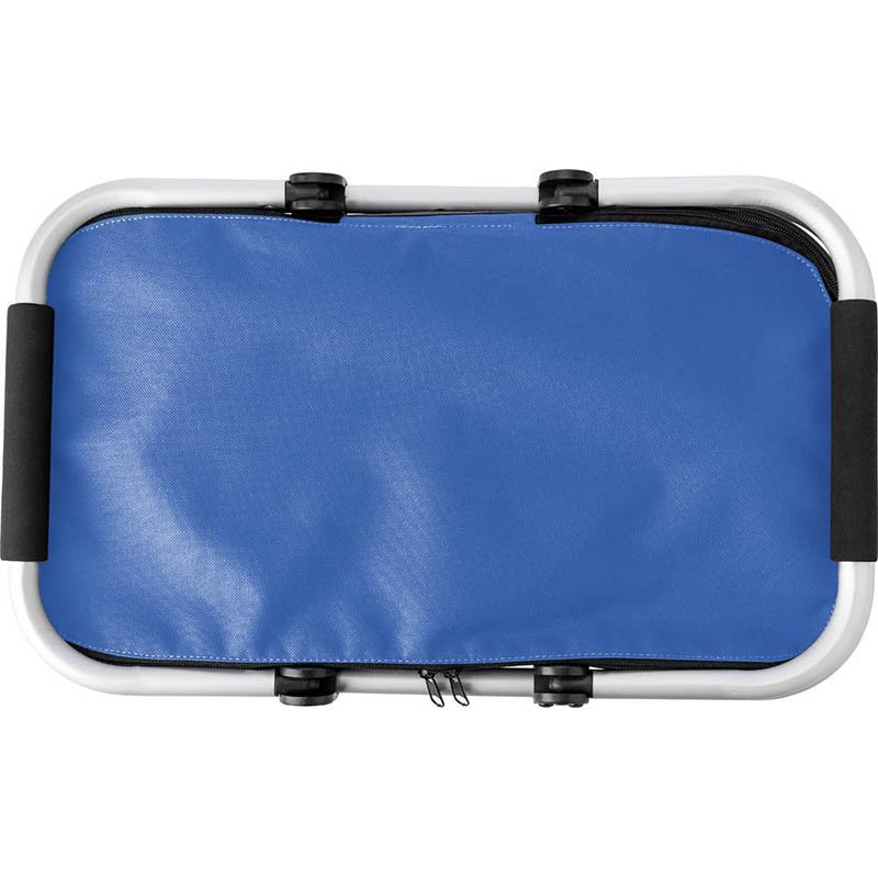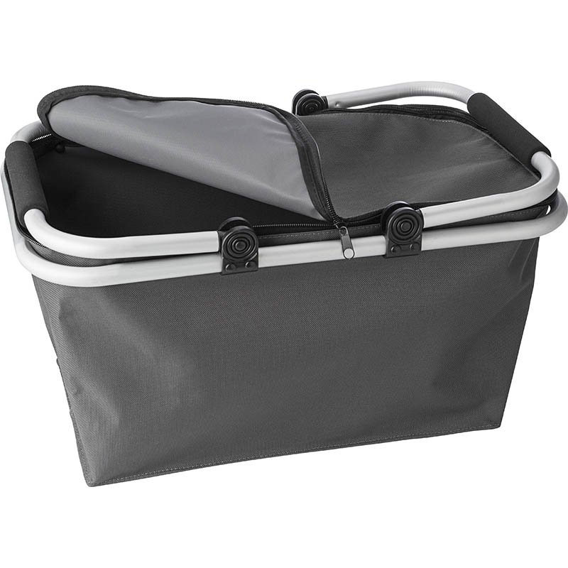 Polyester (320-330 gr/m2) collapsible shopping basket, with an aluminium frame and handles with EVA foam grip; can be closed at the top with a zipper.