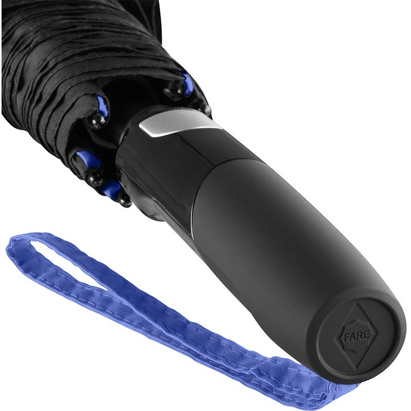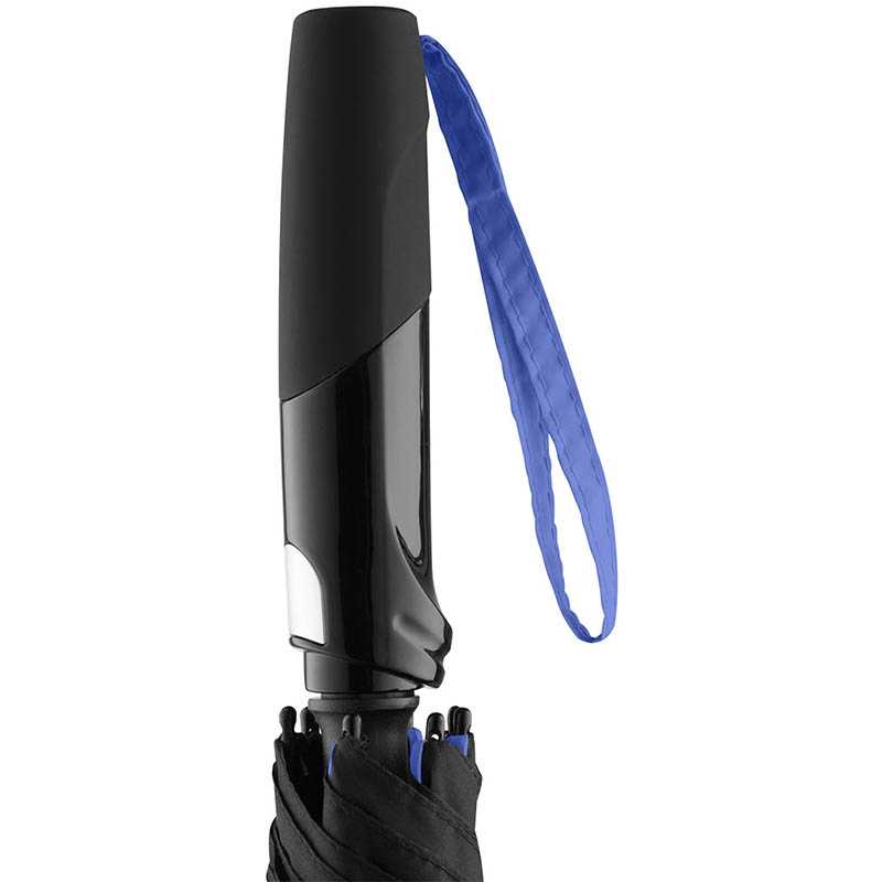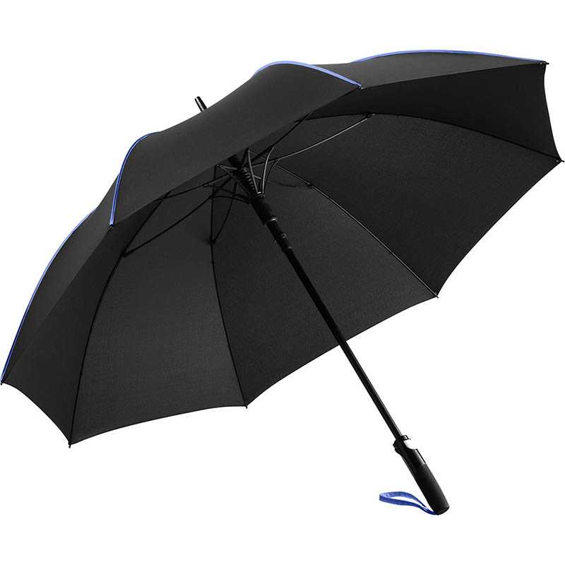 Convenient automatic function for quick opening, high-quality Windproof PLUS system for maximum frame flexibility in stormy conditions, flexible fibreglass ribs, striking cover decoration with coloured panel seam pipings, matt/shiny contrasting Soft-Touch handle with integrated push-button and promotional labelling option, coloured handle strap, higher corrosion protection due to black galvanisation of the steel shaft. Also available as mini umbrella (art. 5639).