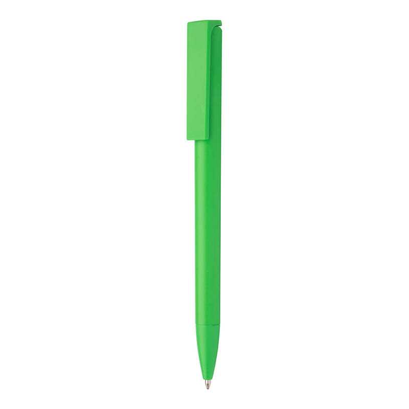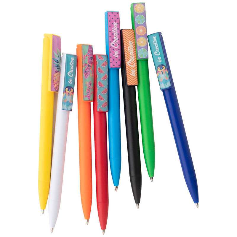 Plastové guľôčkové pero s modrou náplňou. Toto guľôčkové pero sa vďaka svojmu štíhlemu tvaru dokonale hodí do slučiek poznámkových blokov.
