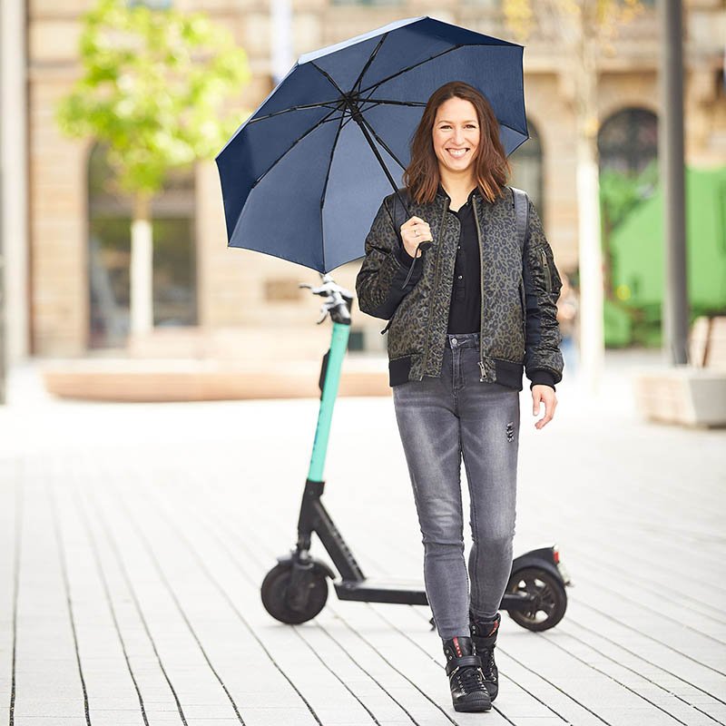 Easy to handle thanks to sliding safety runner, high-quality Windproof PLUS system for maximum frame flexibility in stormy conditions, cover with 3M™ Scotchlite™ Reflective Material at the panel corners as a trendy detail, ergonomically shaped soft-feel handle, convenient sleeve with press button, awarded with reddot design award honourable mention 2011. Further Safebrella®-umbrellas: 5171, 5471, 5571 and 7571.