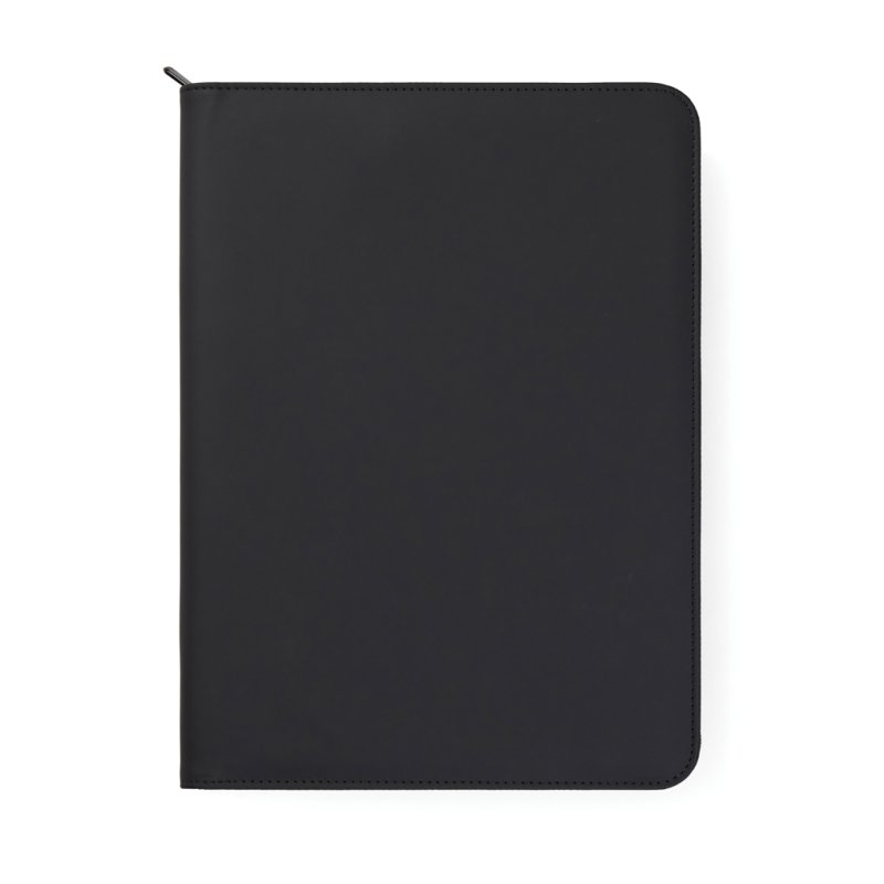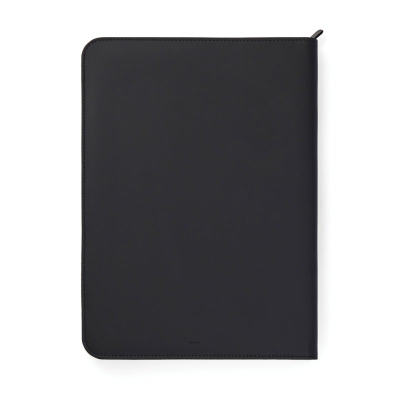 Portfólio vo formáte A4 vyrobené z recyklovanej kože s čiernou elastickou gumičkou. Pre uchovanie dokumentov, vizitiek, kariet a ďalších esenciálnych kancelárskych potrieb. 1 veľké otvorené vrecko, 3 menšie vrecká a 4 sloty na vizitky. Vrátane poznámkového bloku s 24 stranami A4 a linkovaným papierom o gramáži 64 g/m2.
