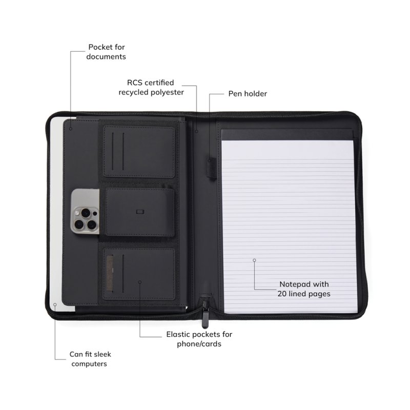 Portfólio A4 z 80 % recyklovaných materiálov s magnetickým zapínaním. Obsahuje zápisník s 80 linajkovými stranami FSC™. Vrecko na tablet do 10", vrecko na mobilný telefón do 6,5", 3 priehradky na karty a 4 elastické pútka pre všestranné použitie.