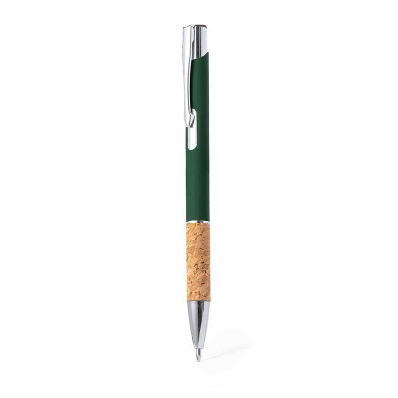 NOVINKA 2025. Elegant ball pen in nature line, with push-button mechanism. Durable aluminium barrel with rubberised finish and cork grip, with barrel in a wide range of distinctive colours. Metal clip, with retractable push button and blue ink. Presented in an individual recycled pouch.Made with plant-based elements to encourage the use of natural raw materials and reduce pollutant emissions.