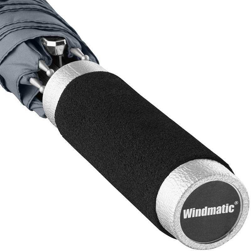 Convenient automatic function for quick opening, high-quality Windproof PLUS system for maximum frame flexibility in stormy conditions, flexible fibreglass ribs, lightweight but strong aluminium shaft, externally coated cover, aluminium coloured handle with black soft material and promotional labelling option