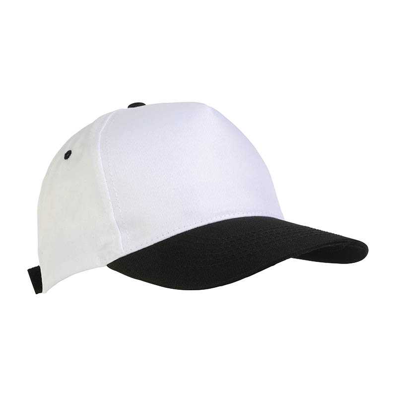 Cotton twill cap with five panels and an adjustable plastic fastening.