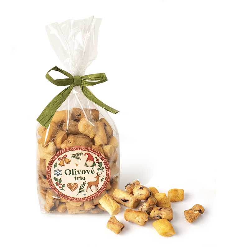 Slané mini z olivového cesta so syrom a s kúskami sušených paradajok a čiernych olív. 150 g