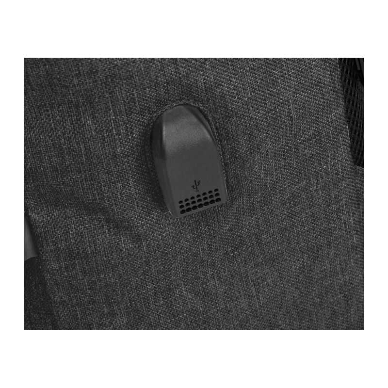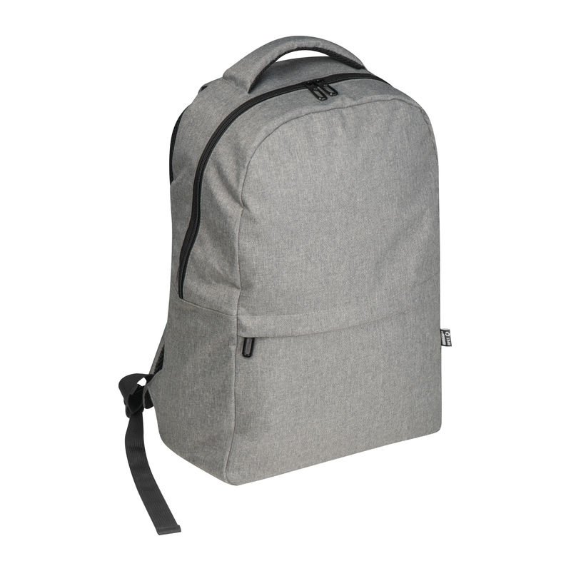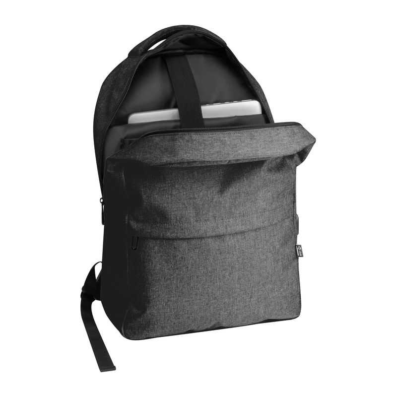 rPET batoh s USB portom, polstrovanými popruhmi, priehradkou na notebook, prednou priehradkou a priehradkou proti krádeži.