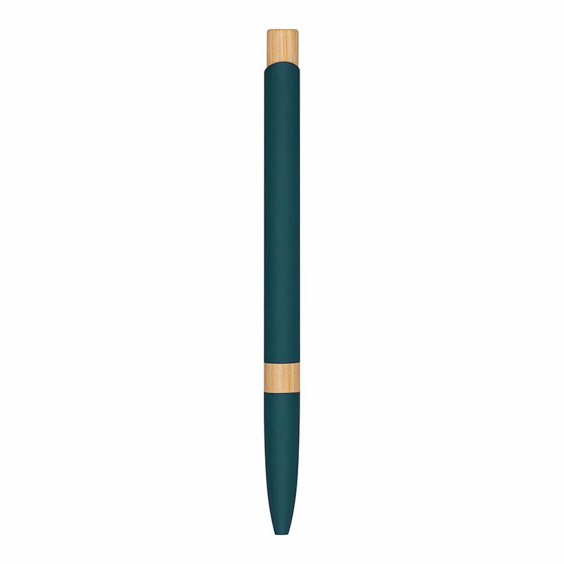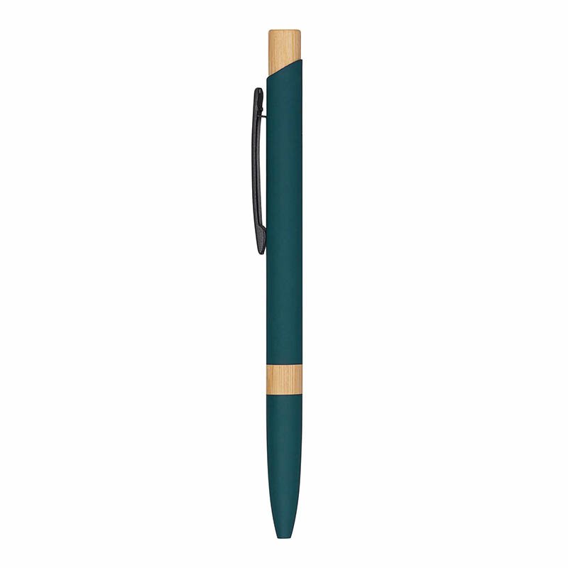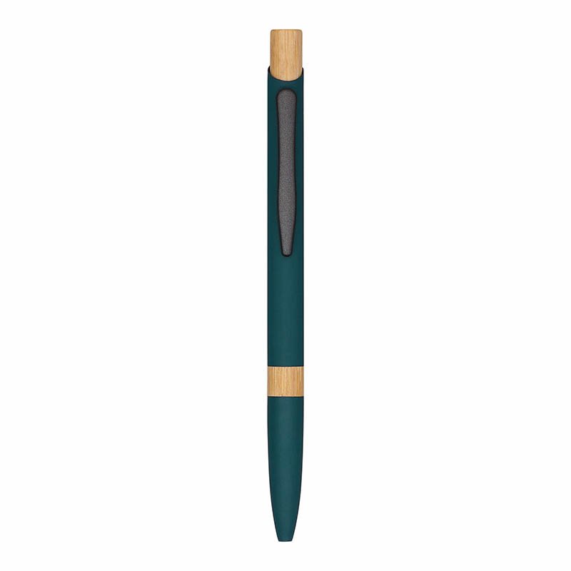 NOVINKA 2025. Stylish bamboo and Aluminium ball pen with push-button mechanism. Hard-wearing Aluminium barrel with shiny finish and bamboo grip, availablel in a range of distinctive colours. Metal clip, with bamboo push button and blue ink. Presented in an individual recycled pouch.Materials such as bamboo promote the use of natural raw materials, thus reducing pollutant emissions. It comes from a highly resistant and versatile plant, with rapid growth and regeneration, making it an excellent alternative to the use of traditional wood.