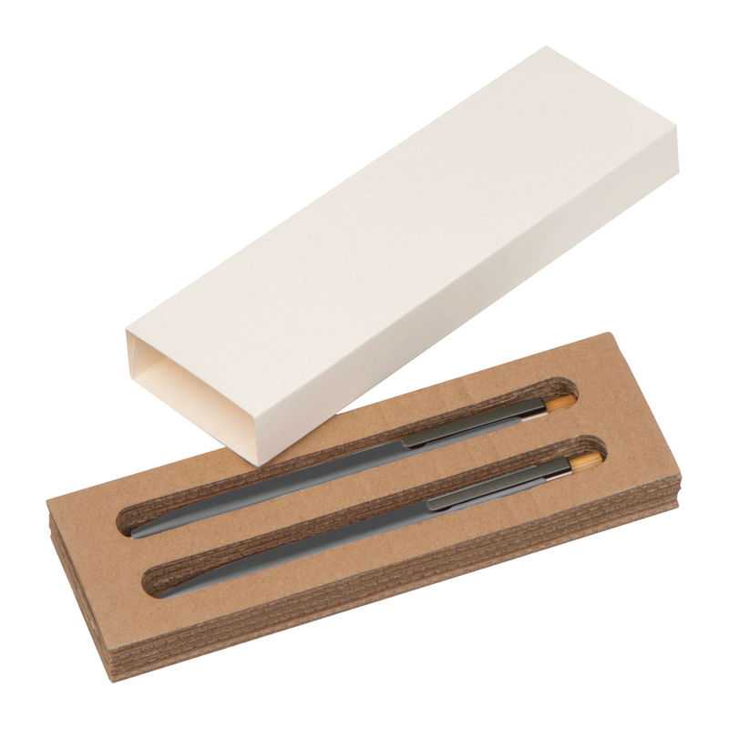 Sada obsahuje guľôčkové pera a bezatramentové pero, obidve vyrobené z recyklovaného hliníka (94%). Guľôčkové pero má modrý atrament. Dodávané v darčekovej krabičke z kraftového papiera, vyrobené z certifikovaného FSC™ materiálu.