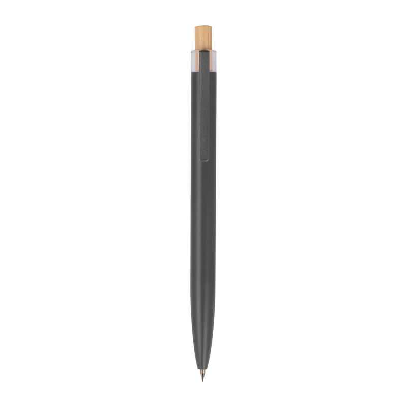 Písací set obsahujúci guľôčkové pero s modrou náplňou Semi-Gel a mechanickú ceruzku, z recyklovaného hliníka, s kovovým klipom a bambusovým tlačidlom v ekologickej krabičke.