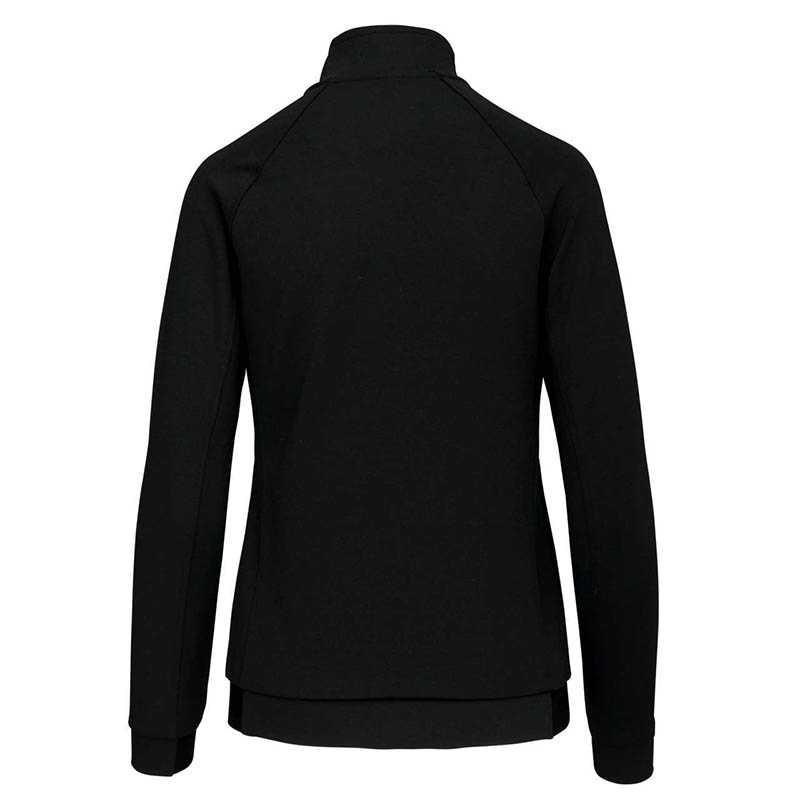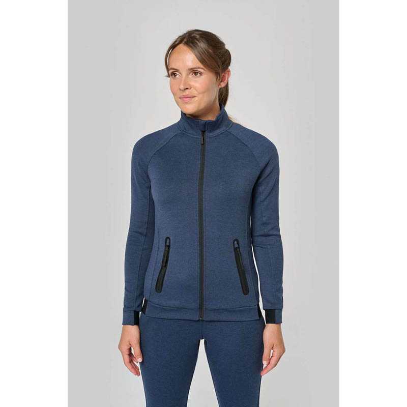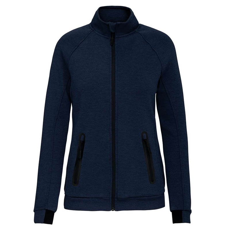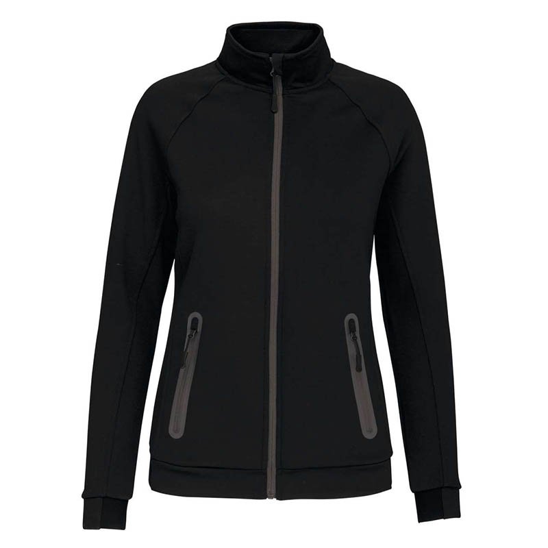 Sporty polyester full zip sweater with raglan sleeves and a two-tone drawstring. Front zip and zipped pockets with contrasting zipper puller. Hidden zipper in the collar to easily replace the drawstring. Size: XS-2XL
