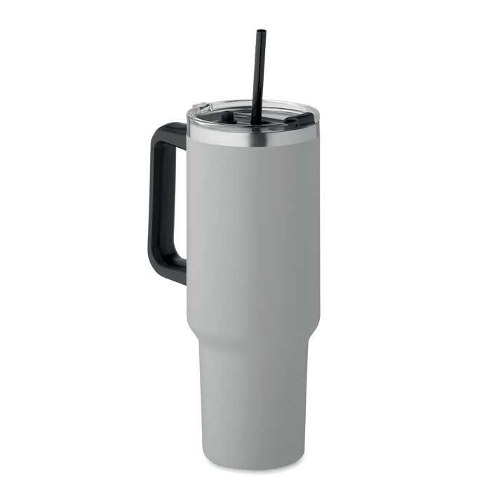 Dvoustěnný hrnek z recyklovaného nerezu s víčkem a brčkem z PE. Objem 1200 ml. (90 % recyklované nerezové oceli a 10 % nerezové oceli).