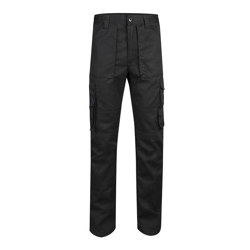 Front closure with zip and button Reinforced fabric at the back Reinforced fabric in the knee area Knee-height compartment for knee pads with Velcro closure Double reinforced topstitchin