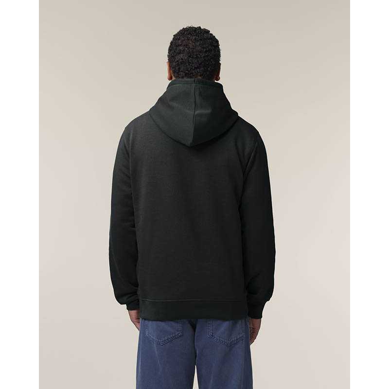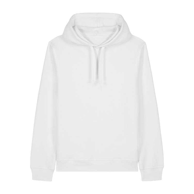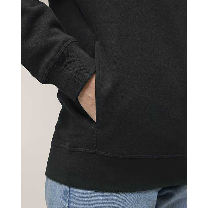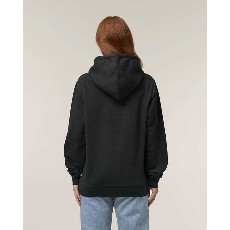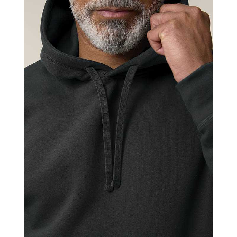 85 % organická bavlna/15 % recyklovaný polyester.Prstencovo spriadaná česaná bavlna.Rovný strih.3-vrstvový kartáčovaný flís, LSF (Low Shrinkage Fleece: predzrazený flís).1/2 kruhu vzadu.Klokanie vrecko.1 x 1 rebrovaný spodný okraj a manžety.Dvojité prešívanie na manžetách, prieramkoch, spodnom okraji a 1/2 kruhu.Podlepený výstrih vnútri na zadnej strane.Podšitá kapucňa z hlavného materiálu so zaväzovaním na šnúrku.Okrúhla šnúrka s recyklovanými kovovými koncovkami a očkami.