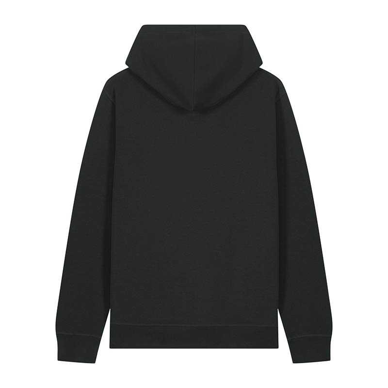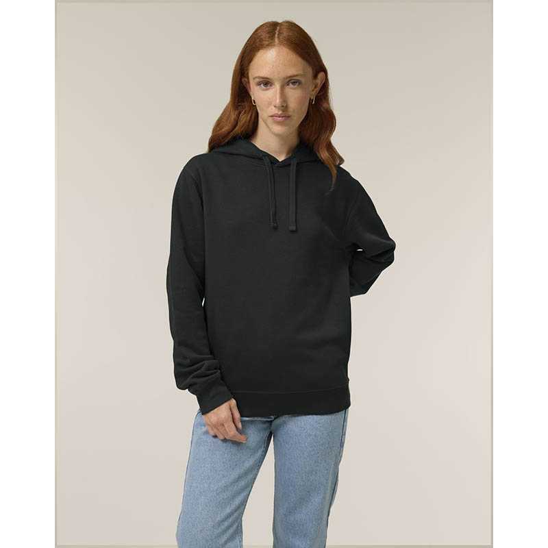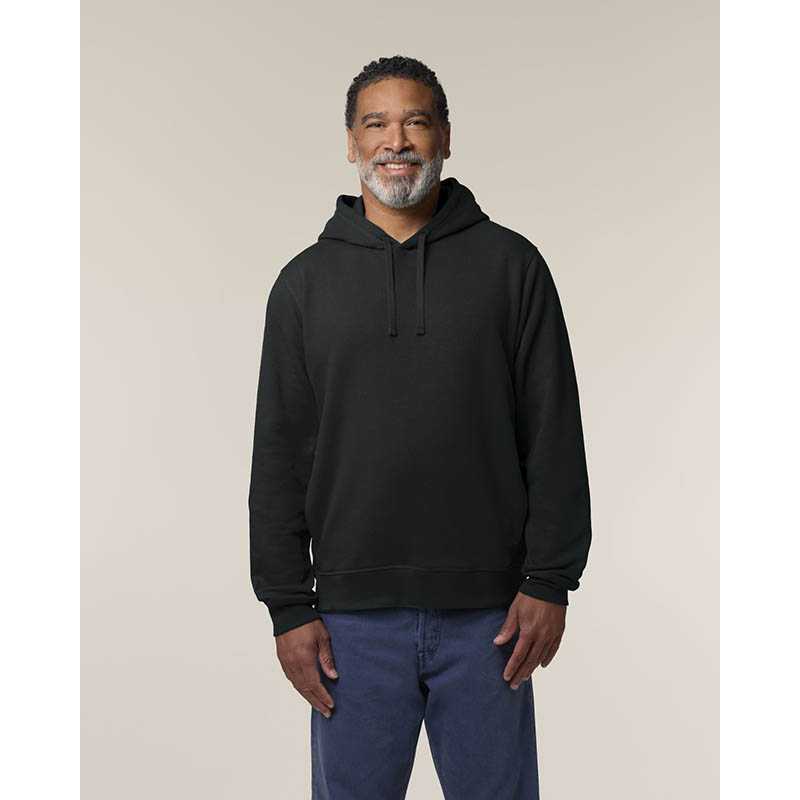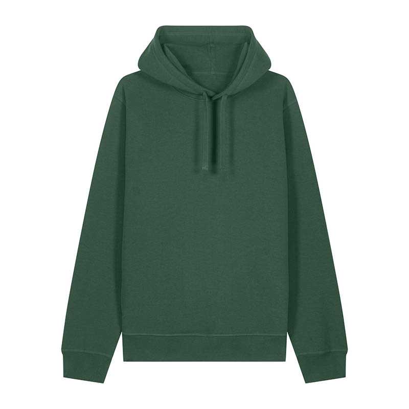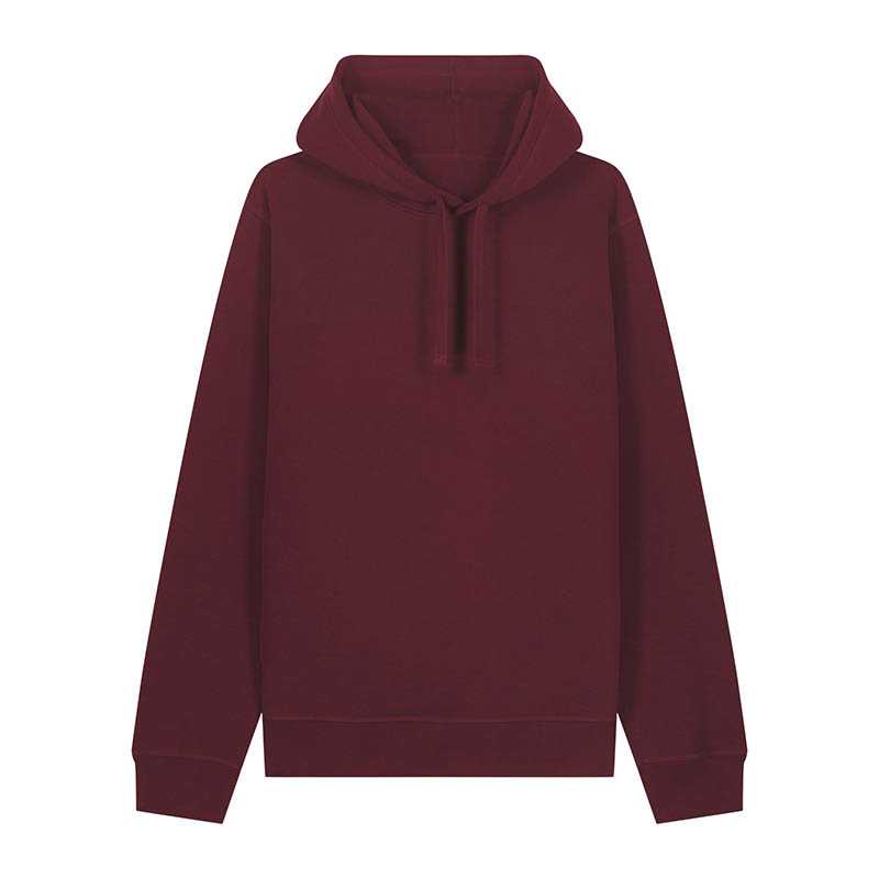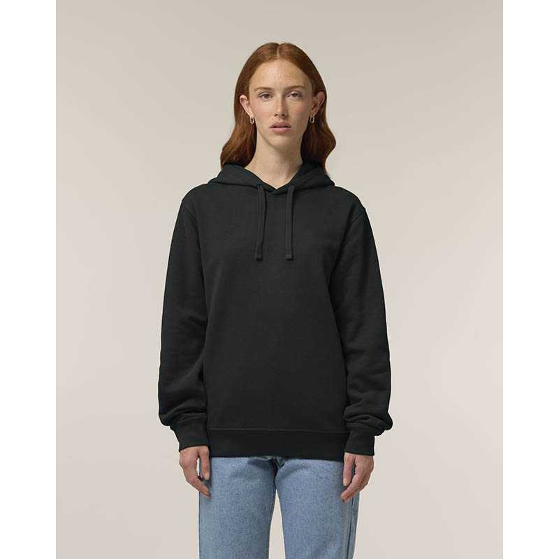 85 % organická bavlna/15 % recyklovaný polyester.Prstencovo spriadaná česaná bavlna.Rovný strih.3-vrstvový kartáčovaný flís, LSF (Low Shrinkage Fleece: predzrazený flís).1/2 kruhu vzadu.Klokanie vrecko.1 x 1 rebrovaný spodný okraj a manžety.Dvojité prešívanie na manžetách, prieramkoch, spodnom okraji a 1/2 kruhu.Podlepený výstrih vnútri na zadnej strane.Podšitá kapucňa z hlavného materiálu so zaväzovaním na šnúrku.Okrúhla šnúrka s recyklovanými kovovými koncovkami a očkami.