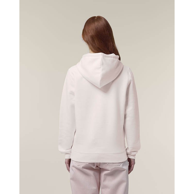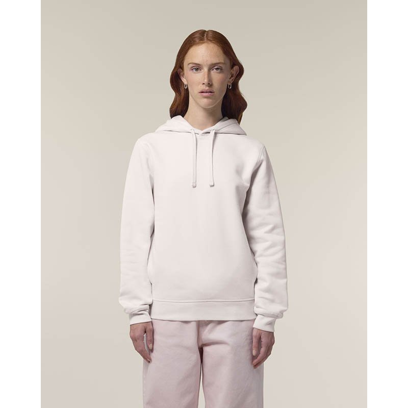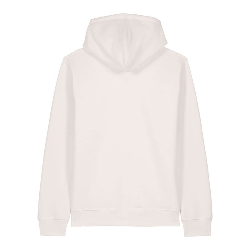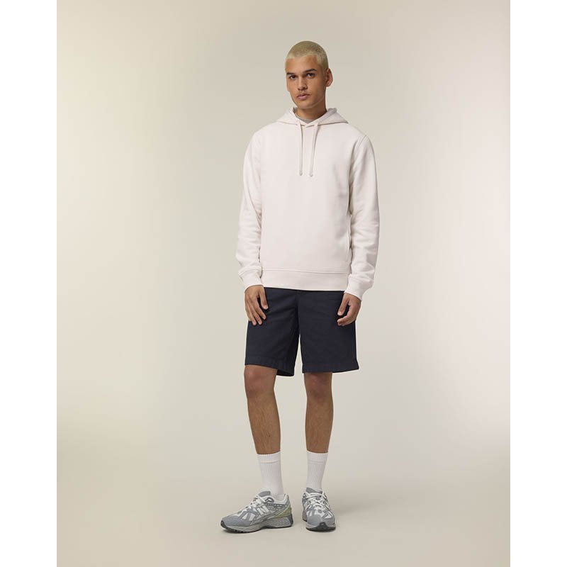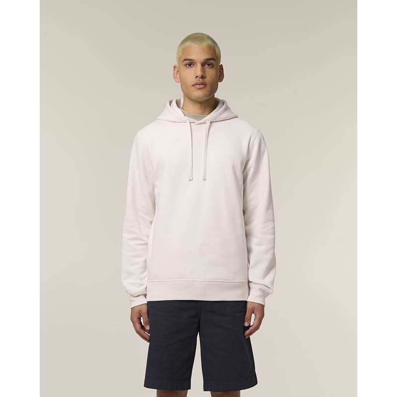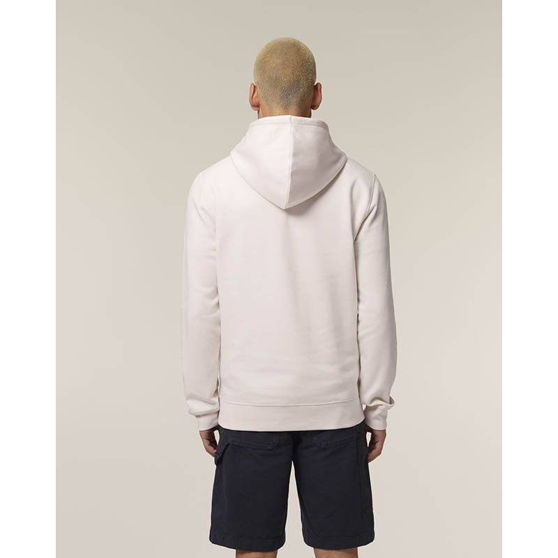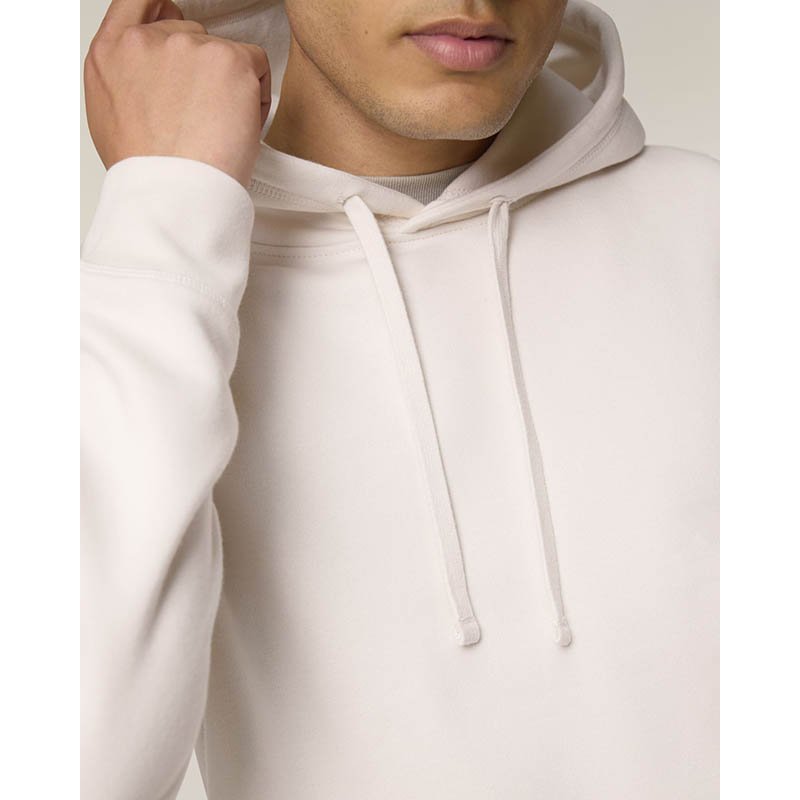 85 % organická bavlna/15 % recyklovaný polyester.Prstencovo spriadaná česaná bavlna.Rovný strih.3-vrstvový kartáčovaný flís, LSF (Low Shrinkage Fleece: predzrazený flís).1/2 kruhu vzadu.Klokanie vrecko.1 x 1 rebrovaný spodný okraj a manžety.Dvojité prešívanie na manžetách, prieramkoch, spodnom okraji a 1/2 kruhu.Podlepený výstrih vnútri na zadnej strane.Podšitá kapucňa z hlavného materiálu so zaväzovaním na šnúrku.Okrúhla šnúrka s recyklovanými kovovými koncovkami a očkami.