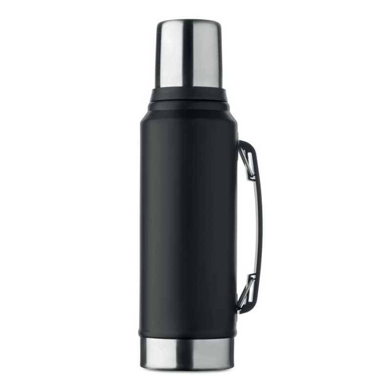 Dvoustěnná vakuová izolační láhev z recyklované nerezové oceli (90 % recyklované nerezové oceli a 10 % nerezové oceli) s boční rukojetí. Víčko z PP a kelímkem z recyklované nerezové oceli. Objem: 1 l.