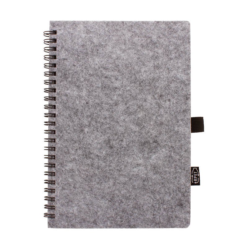 Špirálový blok A5 potiahnutý RPET plsťou s výrazným štítkom RPET a 80 linajkovými listami z recyklovaného papiera.