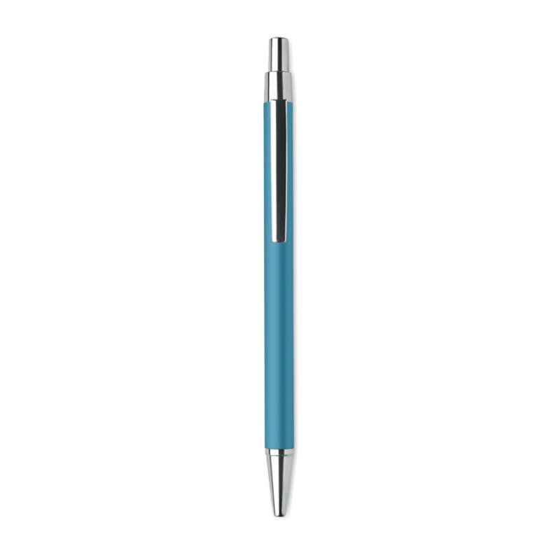 Hliníkové guľôčkové pero s farebným telom a gumenou úpravou. Dostupné v širokej škále farieb. Modrý atrament. o10 x 137 mm