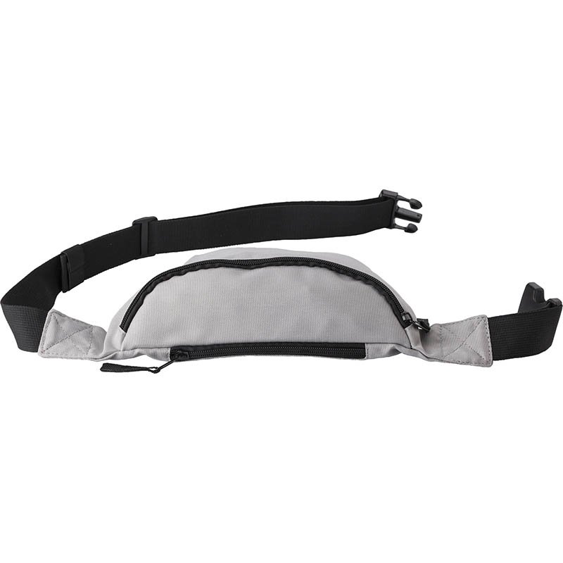Polyester (600D) waist bag with one front pocket and one small pocket on the backside. Both pockets can be closed by a zipper. With black adjustable strap with firm buckle closure.