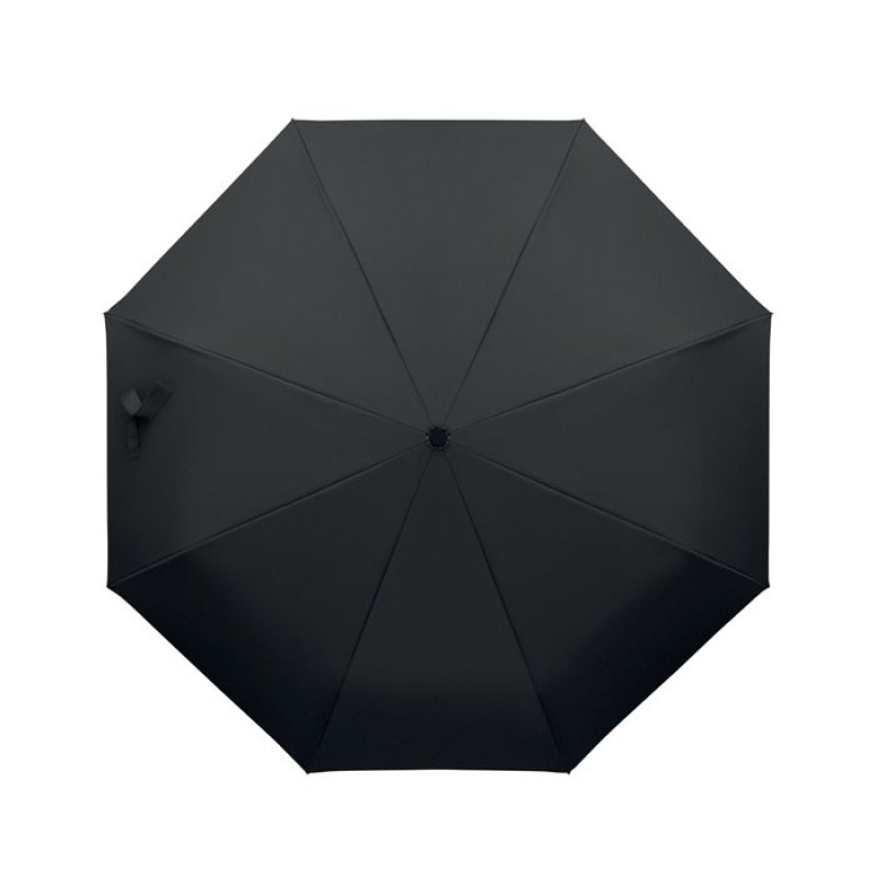 Skládací 21'' větruodolný deštník s černě pokovenou tyčí. Sklolaminátová žebra. Panely z pongee 190T RPET. Rukojeť s karabinou a pogumovanou úpravou. Automatické otevírání a zavírání. Včetně pouzdra.