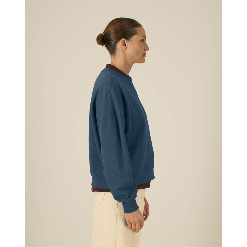 Sweatshirt with round neck and brushed lining. 2x2 ribbing on the collar edge, end of sleeves and bottom hem. Decorative seams in overlock knit set in a tone-in-tone feature. Ladies fit.