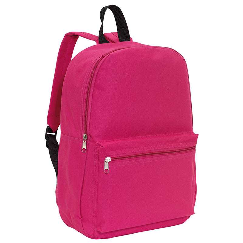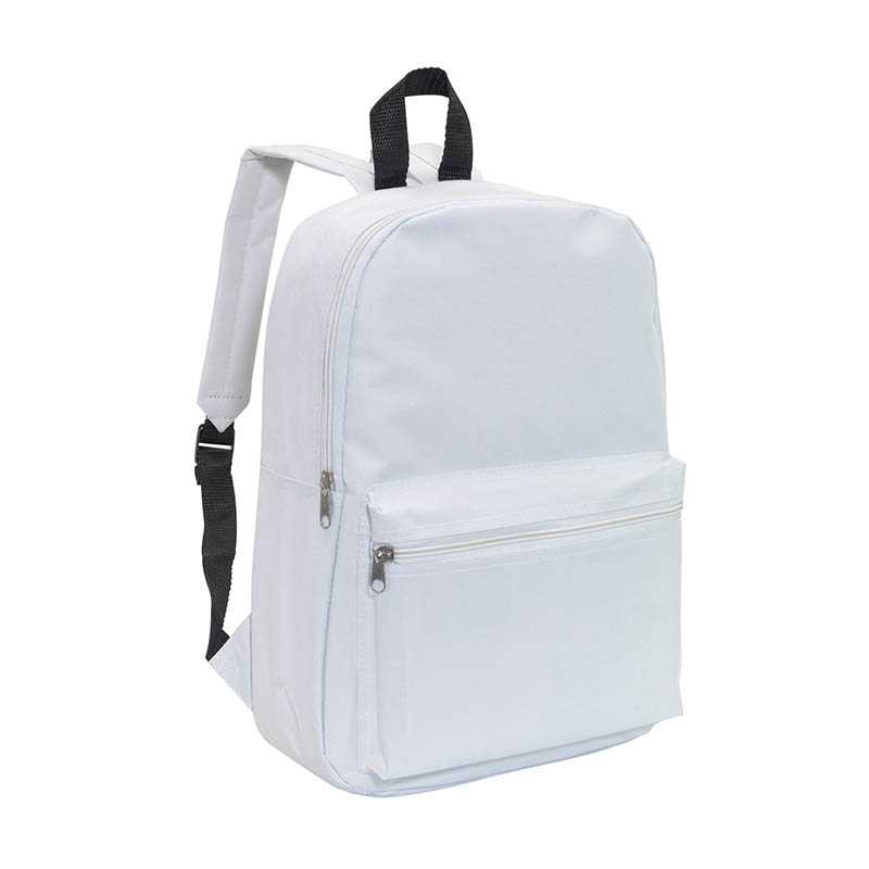 Polyester (600D) backpack with zipper on the main compartment and front pocket. The bag has adjustable, padded shoulder straps.