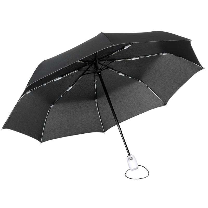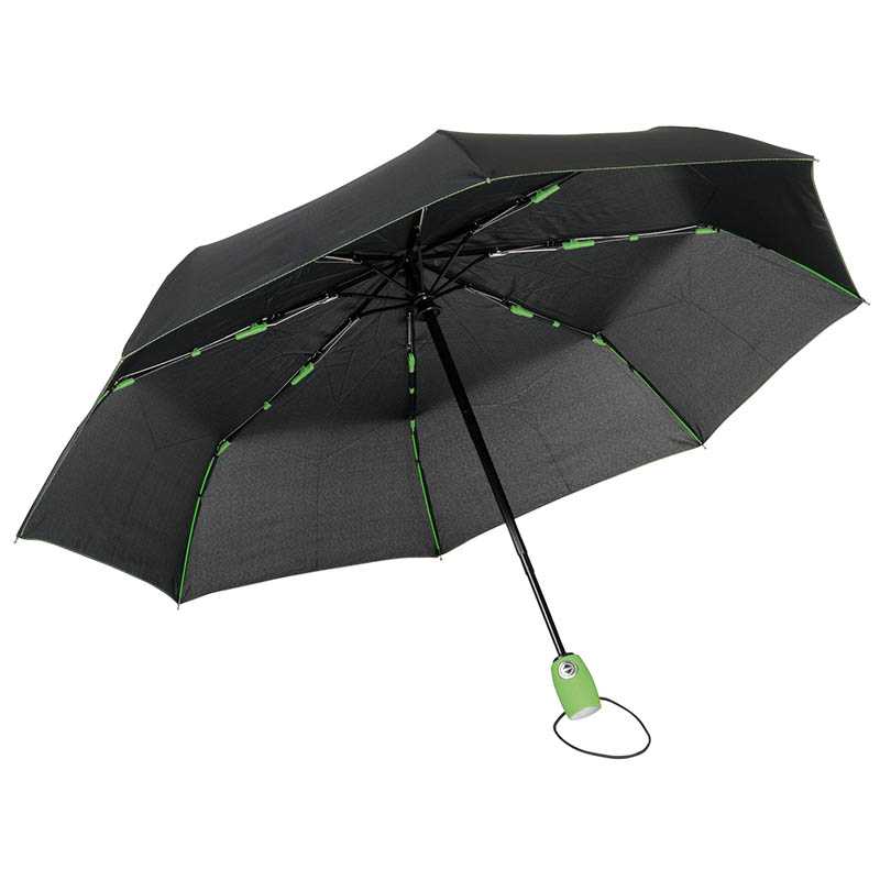 Easy to handle thanks to safety runner, high-quality Windproof PLUS system for maximum frame flexibility in stormy conditions, cover with 3M™ Scotchlite™ Reflective Material at the panel corners as as a trendy detail, Soft-Feel handle with LED light, light head (incl. battery) changeable to continuous white light and flashing red light, convenient sleeve with press button, Batteries (2 x CR2025) included in the scope of delivery. Further Safebrella®-umbrellas: 5071, 5471, 5571 and 7571.