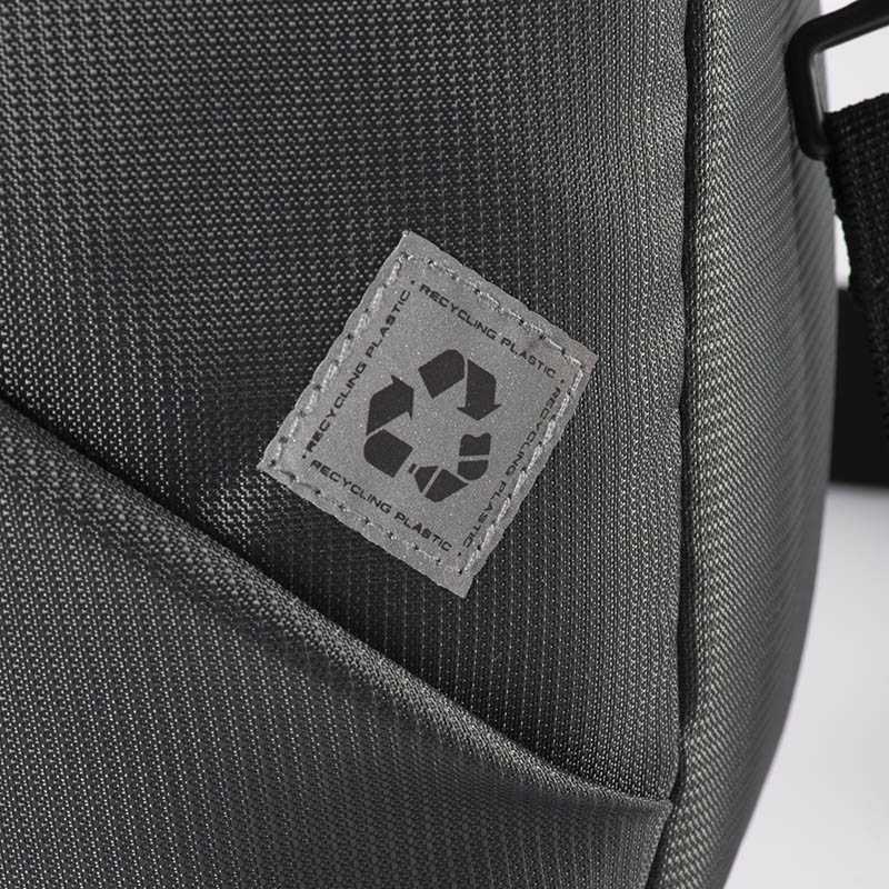 Laptop bag in recycled PET. Paddednotebook compartment. Adjustable andremovable shoulder strap with metal buckle. Trolley attachment system