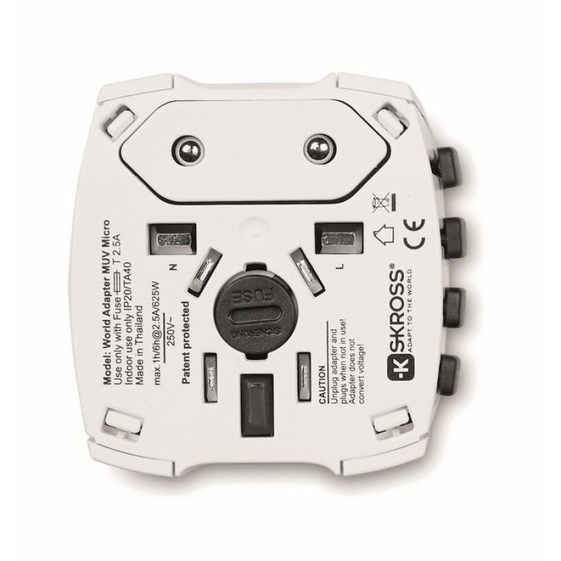 Kompaktní všestranný světový adaptér MUV USB from SKROSS® vše v jednom. Zatímco adaptér poskytuje správné připojení pro váš holící strojek, duální USB nabíječka může doplnit baterie jak ve vašem chytrém telefonu, tak v tabletu. 2 kolíková, neuzemněná. Spl