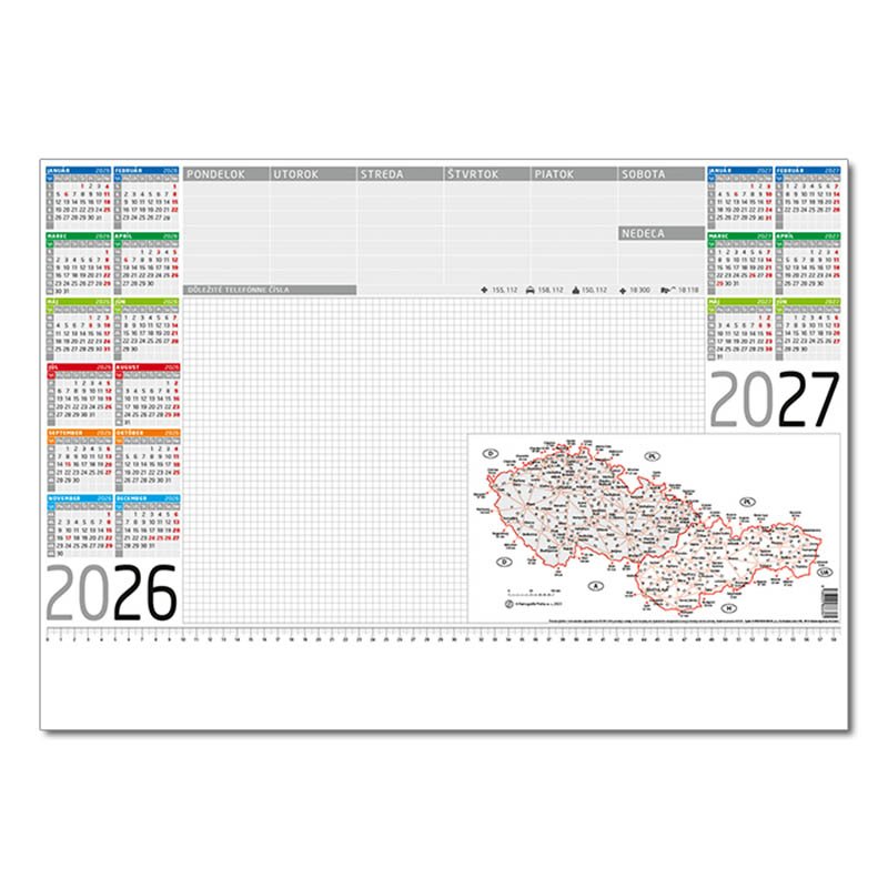 Ideálny doplnok v kancelárii na Váš pracovný stôl. Podložka obsahuje univerzálne  týždenné kalendárium aj kalendárium na rok 2026 a prvých 6 mesiacov v roku 2027 ako aj prehľadnú mapu vzdialeností v Čechach a na Slovensku. Podložka je doplnená o transparentnú plastovú spodnú lištu, ktorá je ideálna na reklamnú potlač. Priestor na potlač: 40 x 5,5 cm. Kalendárium: SK. Rozsah: 20 listov. Formát: 59,5 x 42 cm.