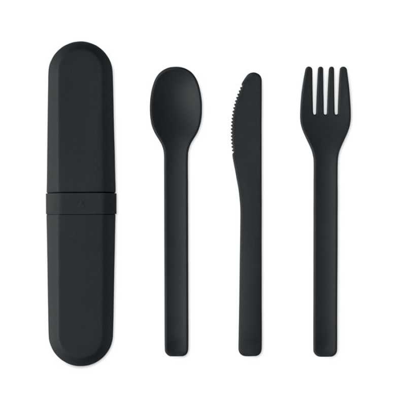 Sada opakovaně použitelných příborů s pouzdrem z kukuřičného PLA. Sada obsahuje vidličku, nůž, lžíci a praktické přenosné pouzdro.