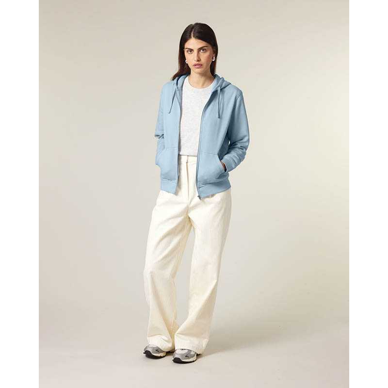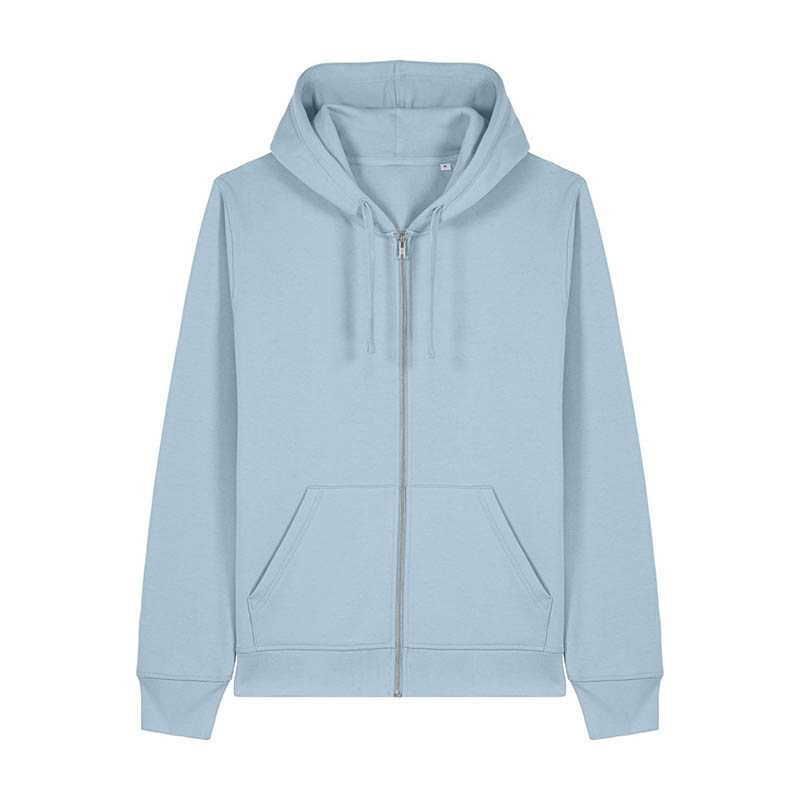 NOVINKA 2025. Set-in sleeves Self fabric lined hood Flat drawcords in matching body colour Embroidered buttonhole eyelets 1x1 rib at sleeves cuffs and bottom hem Kangaroo pocket with flatlock stitches Exposed metal zip at centre front 3 needles flatlo