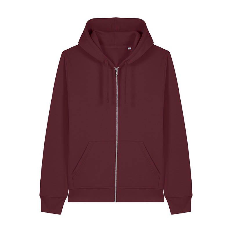 NOVINKA 2025. Set-in sleeves Self fabric lined hood Flat drawcords in matching body colour Embroidered buttonhole eyelets 1x1 rib at sleeves cuffs and bottom hem Kangaroo pocket with flatlock stitches Exposed metal zip at centre front 3 needles flatlo