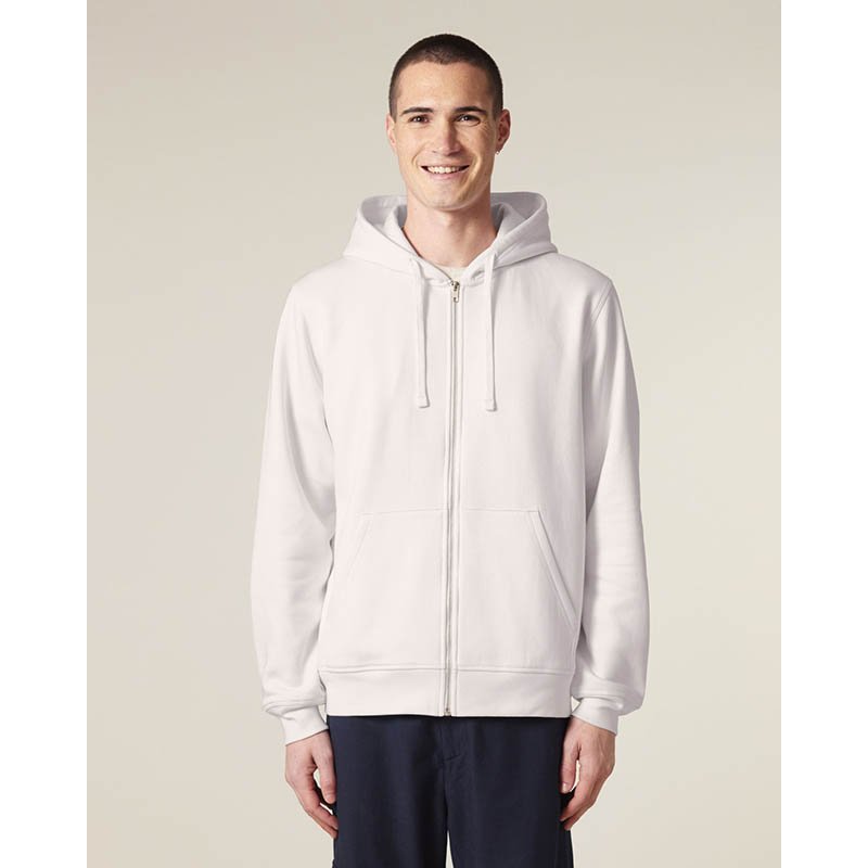 70 % bavlna/26 % polyester/4 % elastan.Česaná bavlna.Interlocková tkanina.Ošetrenie LSI (Low Shrinkage Interlock).Dvojpanelová kapucňa s podšívkou z rovnakej látky ako zvyšok bundy, bez sťahovacej šnúrky.Vrchné prešívanie pri krku.Podlepený výstrih vo výstrihu.Kovový a nylonový zips v rovnakej farbe s vnútorne podlepeným výstrihom.Raglánové rukávy.1 x 1 rebro.2 vrecká v jarmovom šve.Žiadny štítok so značkou, len štítok s veľkosťou na jednoduchý prístup k ozdobám.