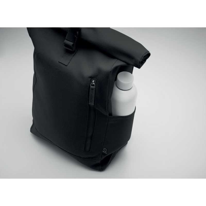 RPET polyester (600D) rolltop backpack. Two zipper pockets on the side. One large compartment. Velcro closing and buckle closing.