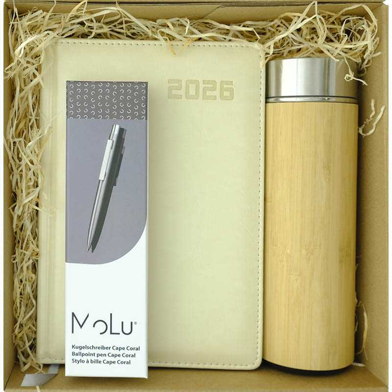 Darčeková krabica > prírodná > 23x23x11cm, Guľôčkové pero z nerezovej ocele Cape Coral (MoLu) > šedá, Termoska (350 ml) > béžová, Diár (Elegant 2026) - 15x21x2,4 cm > biela > denný A5