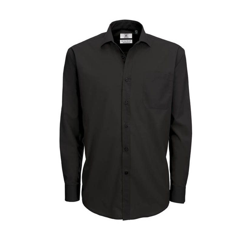 Qualitative polycotton poplin with Easy Care finish, - Cut-away collar, - Cross stitched mother-of-pearl effect buttons, - Folded hem sleeves, - Left chest pocket, - Back yoke with 2 overstitched side pleats, - Inside lap seams for perfect finishing, - Horizontal last buttonhole, - Curved bottom hem, Quality, Out: Poplin, In: Poplin, 65% polyester - 35% combed cotton, 115g/m2, Professional informations, 1 pc/pack & 10 pcs/carton, Regular Fit Značka : B&C . Materiál : 65% polyester / 35% bavlna, 115g/m2
