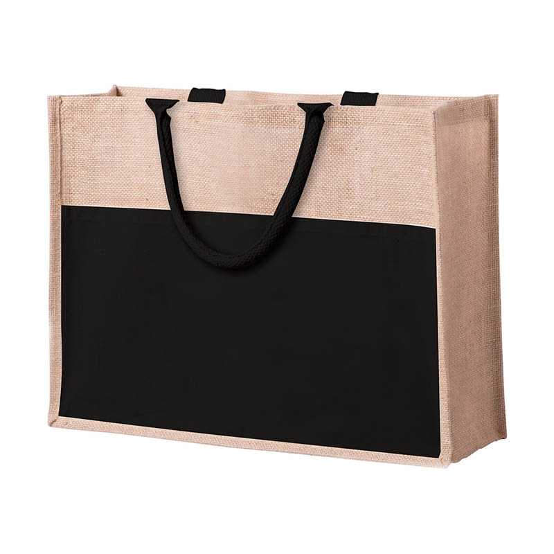 Laminovaná nákupní taška z juty s krátkými uchy.