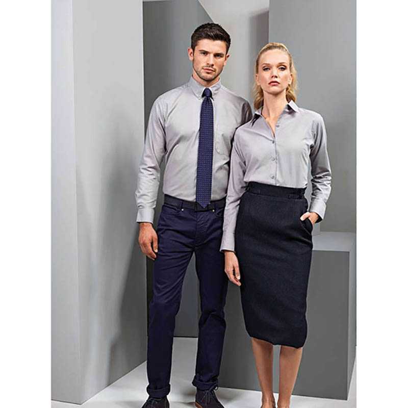 Formálny strih goliera.Dve náprsné vrecká s diagonálnym švom, na gombíky.Vrecko na pero na ľavom náprsnom vrecku.Záložky na aplikáciu výložiek na ramenách.Dlhé rukávy s manžetami zapínanými na gombíky.Strih na mieru.Jednoduchá údržba.