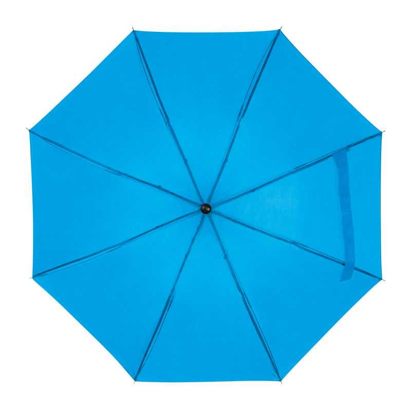Polyester (190T) foldable umbrella with eight panels. Metal frame and wooden handle. Including nylon sleeve.
