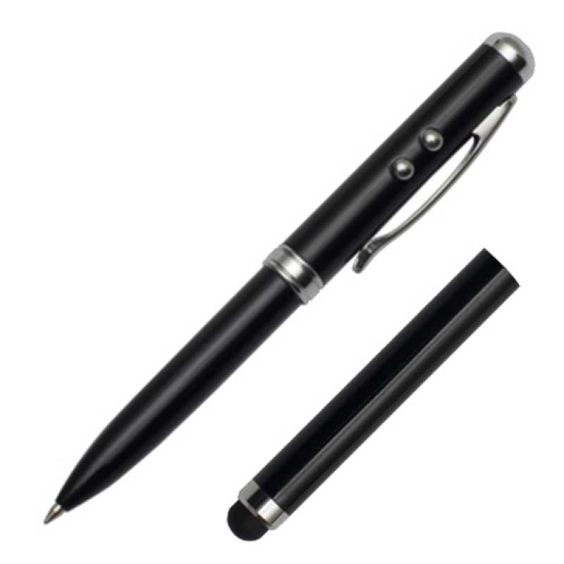 Guľôčkové pero z kovu s modrou náplňou a s laserovým ukazovátkom, LED svietidlom (vrátane 3 batérií LR41) a dotykovým perom (stylusom) v krabičke z kovu.