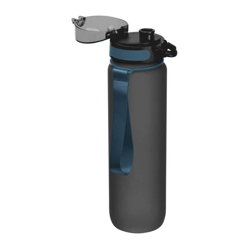 Tritánová športová fľaša s objemom 1000 ml potlačenou stupnicou, bez obsahu BPA, nepriepustným uzáverom a látkovým remienkom na ruku.