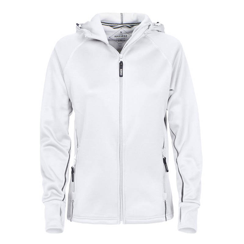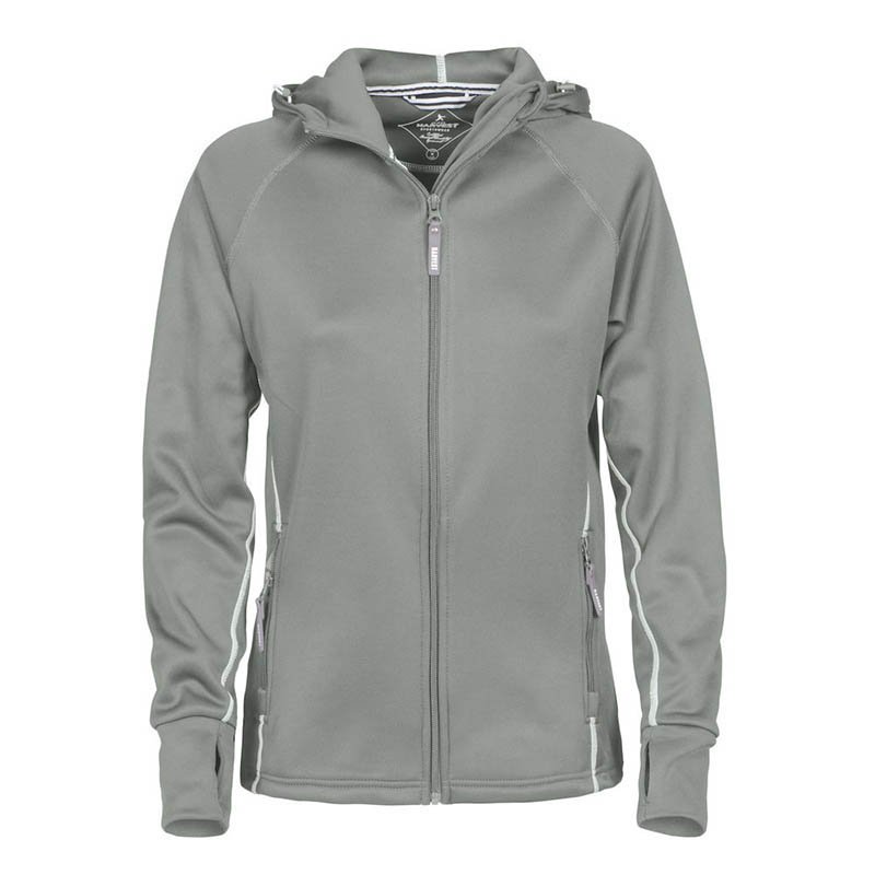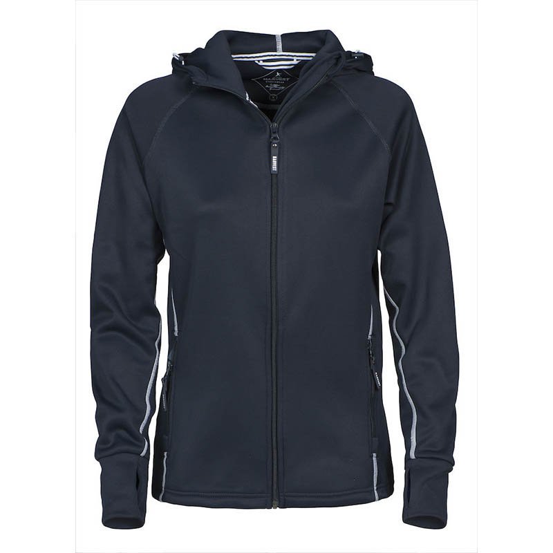 Thick fleece jacket for ladies. Fabric has proven high resistance to pilling. The design is modern and sporty, fitting is modern and comfortable with high front collar. Hood, contrasting flat lock seams and thumbhole at sleeve end. Elastic drawstring at hood and hem.   · XS-XXL · 100% POLYESTER :  300 G/M2 · 900 BLACK, 100 WHITE, 600 NAVY, 135 LIGHTER GREY