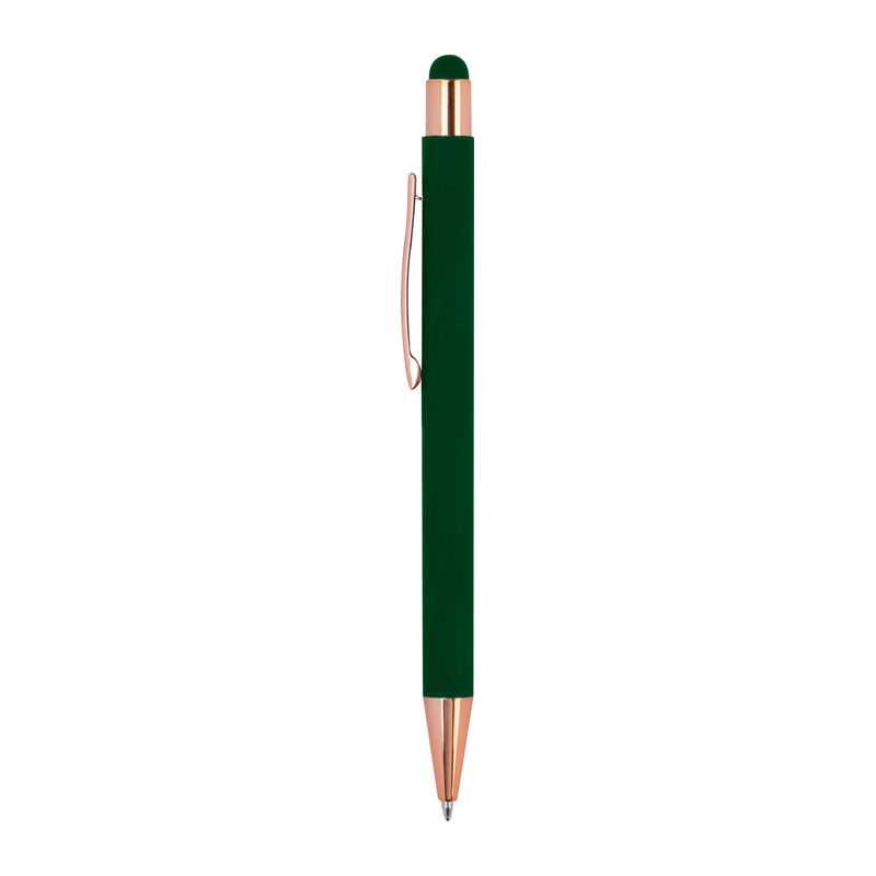 Kovové guľôčkové pero s povrchom soft-touch a ružovo-zlatými aplikáciami. Vybavené náplňou a modrým atramentom.