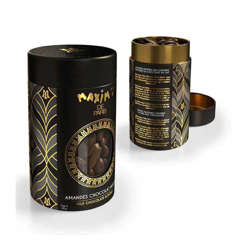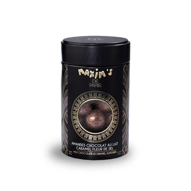A black tin with a Maxim's design for exquisite mint chocolate candies.
