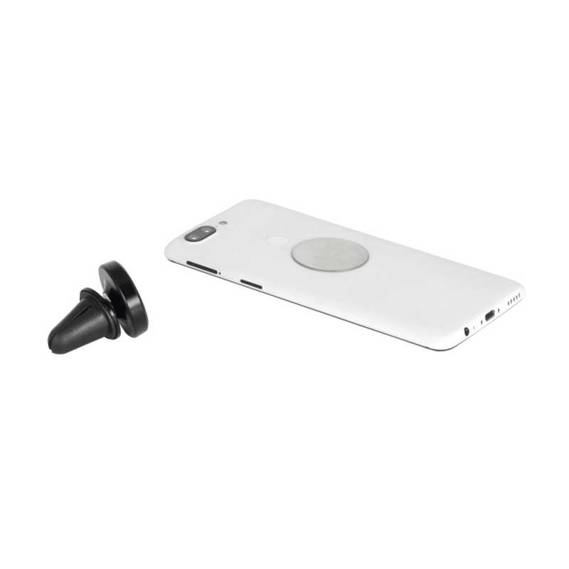 Hliníkový držiak telefónu do vozidla. Výrobok obsahuje magnetický kovový diel s rámom otočným o 360° umožňujúci úpravu nastavenia mobilného telefónu. S priľnavým povrchom na umiestnenie telefónu. o35 x 44 mm