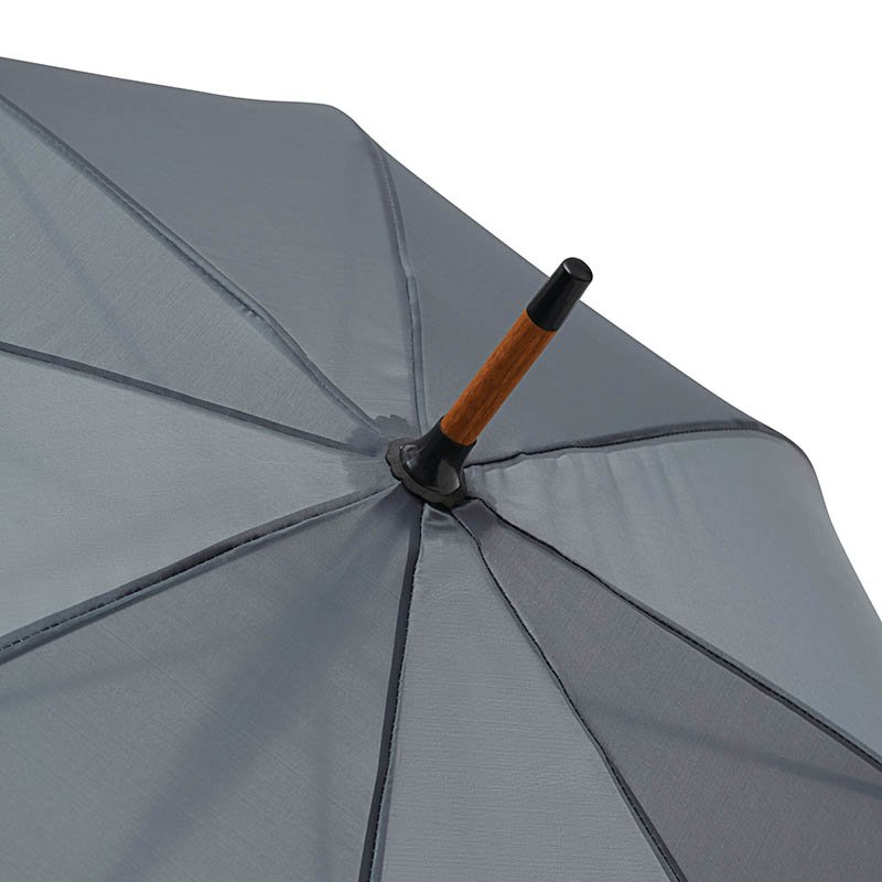 Vysoko kvalitný automatický dáždnik s kostrou zo sklenených vlákien, poťahom z recyklovaného polyesteru a s tvarovanou drevenou rukoväťou.
